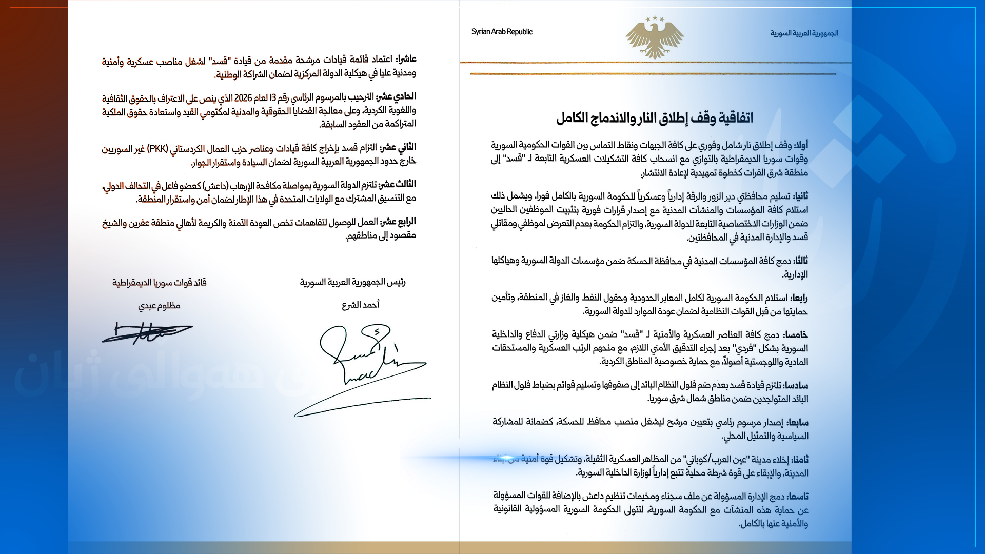 دەقی رێککەوتنی ئەحمەد شەرع و مەزڵوم عەبدی